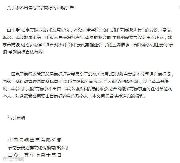 笔者在百度贴吧之中国云铜吧检索发现,中国云铜公司与云瑞之祥公司于2015年7月15日联合发布申明公告,内容声明““云铜”商标永不出售”。若该声明的确为两公司所发,那云瑞之祥公司于2019年将“云铜”商标转让给奥洛海公司,对此两公司又作何解释呢?