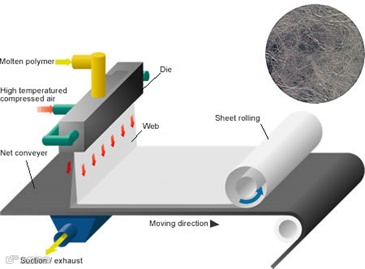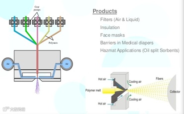 文献中可以看到熔喷布的生产原理,利用热风喷射,从喷丝板的喷头的细孔中挤出热聚丙烯,使其呈纤维状延伸,然后集聚在传送带上,根据其自熔接性形成纤维网。喷丝板上排列很多细小的喷嘴,直径只有0 .15mm,喷嘴喷出的熔融聚丙烯流通过高速空气流延伸并集中在移动的传送带上,获得熔喷布。