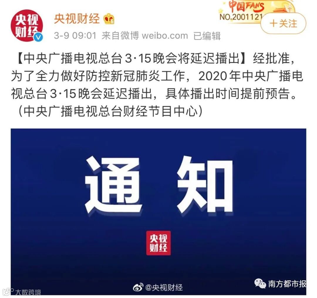 经批准,为了全力做好防控新冠肺炎工作,2020年中央广播电视总台3·15晚会延迟播出,具体播出