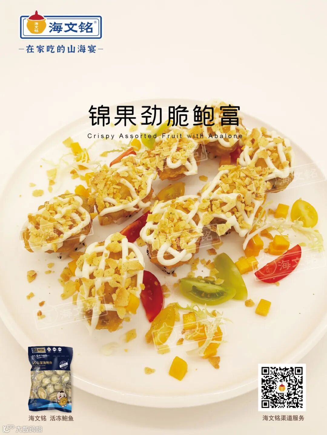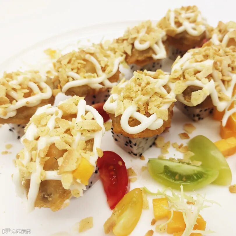 海文铭活冻鲍鱼肉、芒果、火龙果、三色番茄、酥脆薄饼、沙拉酱、脆浆粉