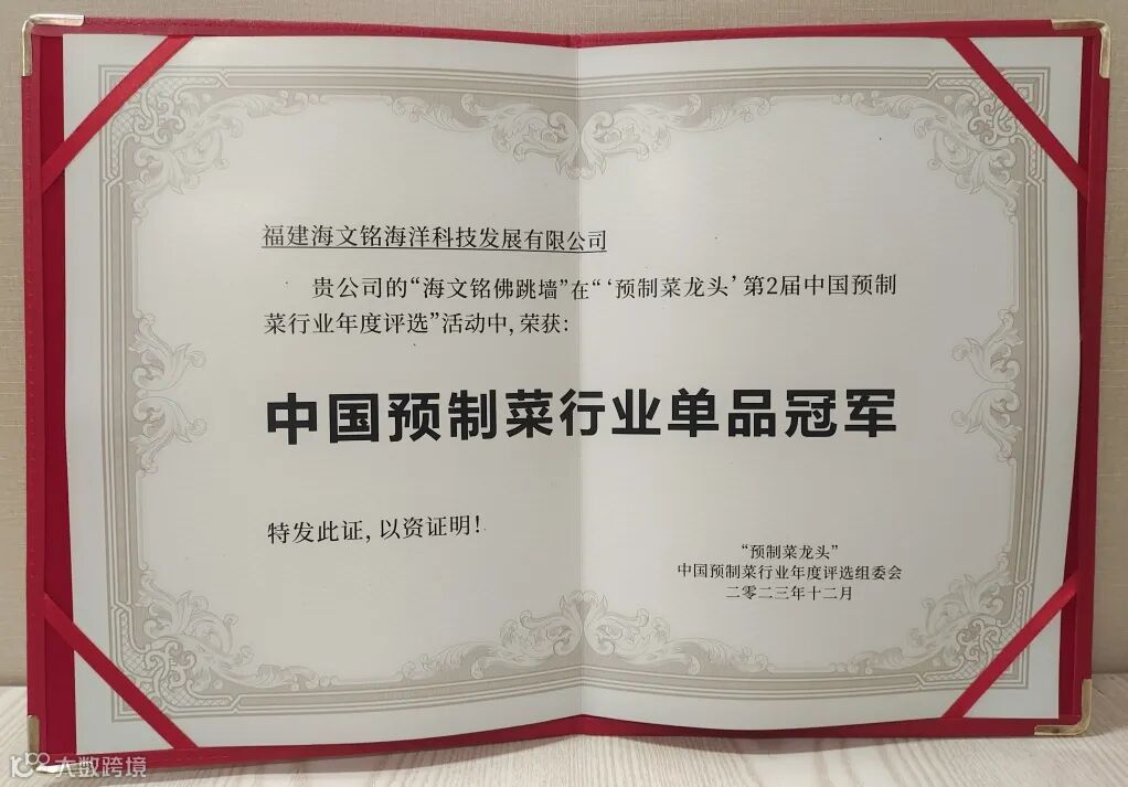 12月1日“‘预制菜龙头’第2届中国预制菜行业年度评选”颁奖典礼在第4届中国预制菜企业家峰会现场隆重举行,表彰一年来在预制菜领域不断突破、追求卓越的企业品牌、创新产品。海文铭作为水产预制菜的知名品牌获得“中国预制菜行业百强品牌”称号,其中海文铭佛跳墙更是获得“预制菜龙头”中国预制菜行业年度评选组委会的一致认可,被评为“中国预制菜行业单品冠军”。