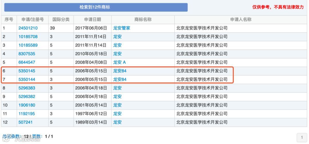 由北京地坛医院出资设立的北京龙安医学技术开发公司从1989年至今共计申请12件商标,但是只有两件商标名称带有“84字样”。这两件商标分别是5350145号第5类“龙安84”商标和5350144号第3类“龙安84”商标。