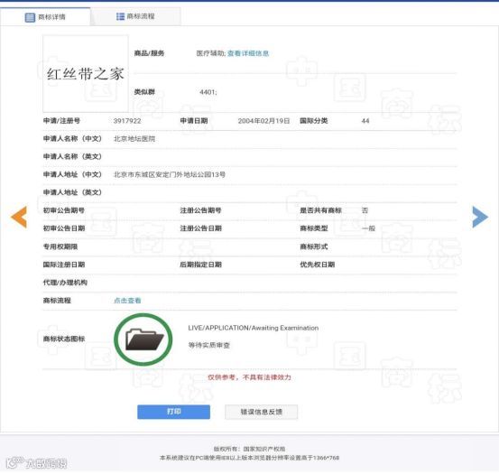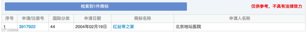 据商标网查询,北京地坛医院只申请了一件商标,该商标为44类3917922“红丝带之家”商标,目前处于等待实施审查状态。