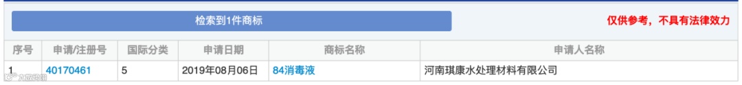 该商标是于2019年8月6日,由河南琪康水处理材料有限公司申请的第5类40170461号“84消毒液”商标,目前还处于等待实质审查状态中。