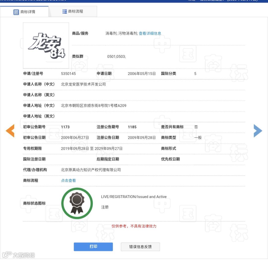 5350145号第5类“龙安84”商标注册成功,该商标指定用于消毒剂、污物消毒剂等商品。