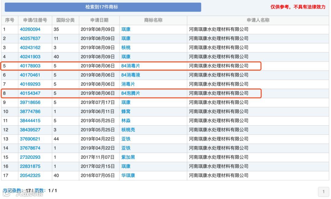 该公司除了这件商标,还曾申请过“84泡腾片”、“84消毒片”商标,但目前都处于等待实质审查状态。