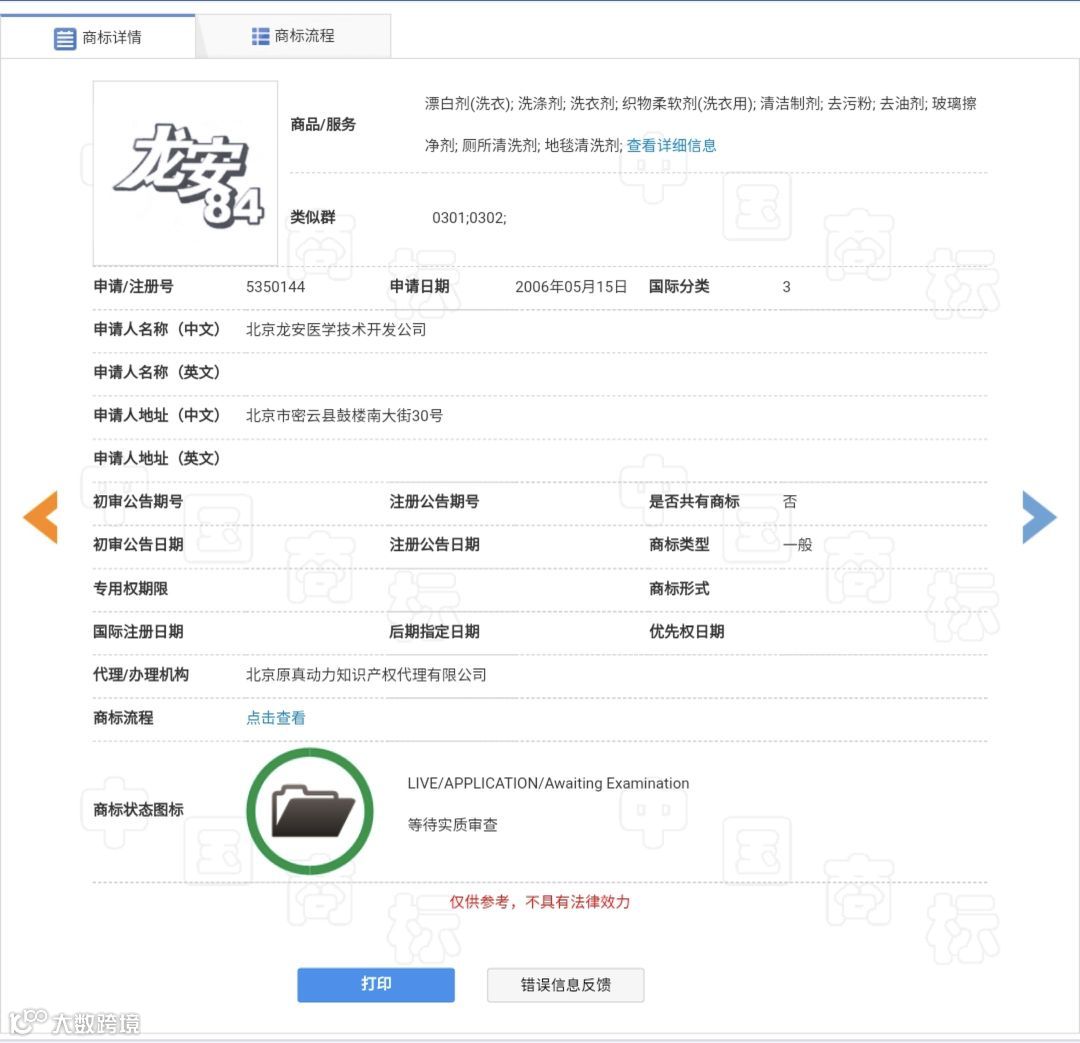 5350144号第3类“龙安84”商标目前还处于等待实质审查状态,该商标指定使用于洗涤剂、洗衣剂、清洁制剂等。