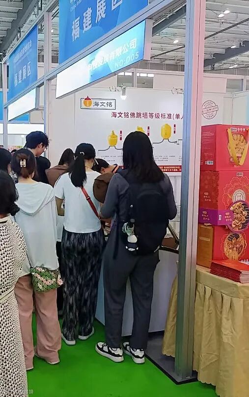 海文铭展位人头攒动,挤满了来自全国各地找食材、品美食、寻合作的各类观众。许多观众被佛跳墙的香味吸引来,试吃台旁一下排起了长队,都想一尝这闽菜头牌的滋味。