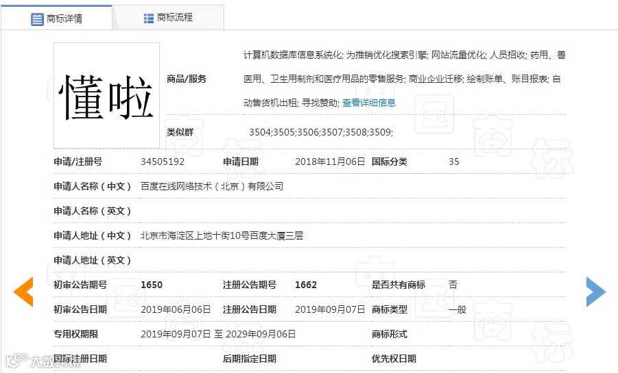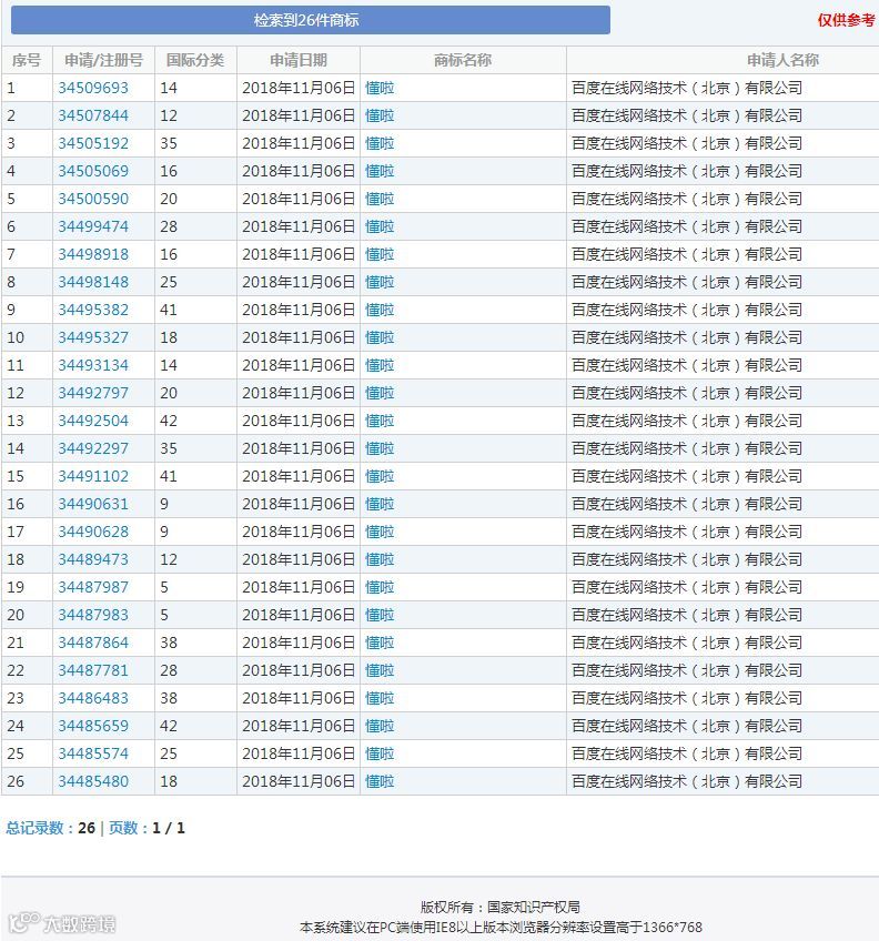 市场未动 ,商标先行,百度面向少儿出品的轻科普短视频产品“懂啦”,涵盖科普百科、文学诗歌、启蒙益智等多个类目,让孩子在寓教于乐中,更好地认知世界,开拓视野,培养学习兴趣。于2018年11月6日,百度向商标局递交了26件商标申请,涵盖13个类别,结果悲剧!仅有一个35类通过了。