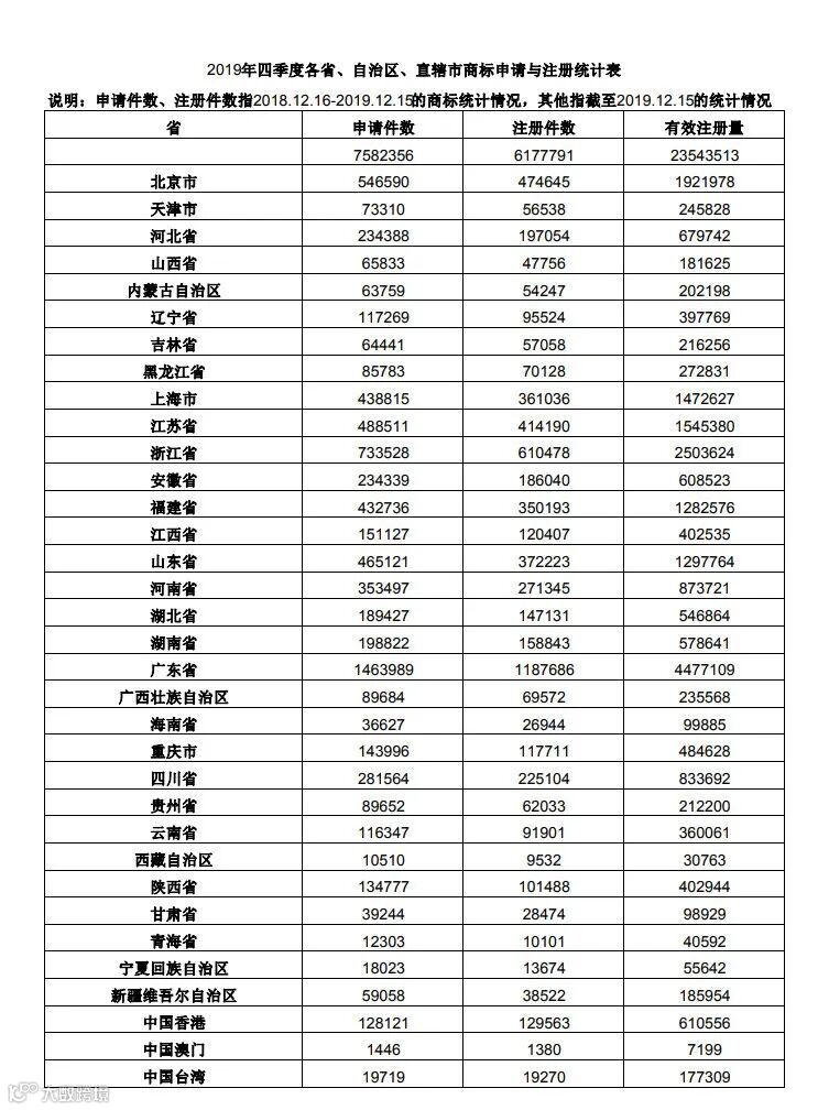 2019年度全国申请量达到758万之多,有效注册量截止目前以往总计约为2354万。