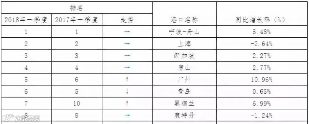 上海国际航运研究中心发布的《2018年第一季度全球港口发展报告》中指出,今年一季度,全球前十大港口完成货物吞吐量14.53亿吨,同比增长1.65%,其中吞吐量5-10名的港口排名变化较大。