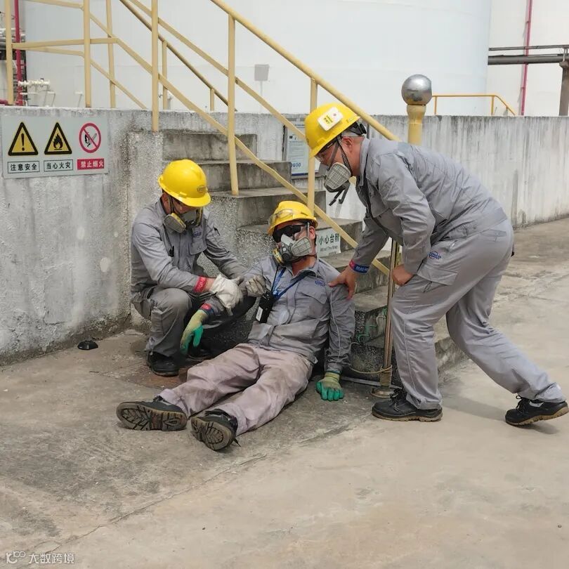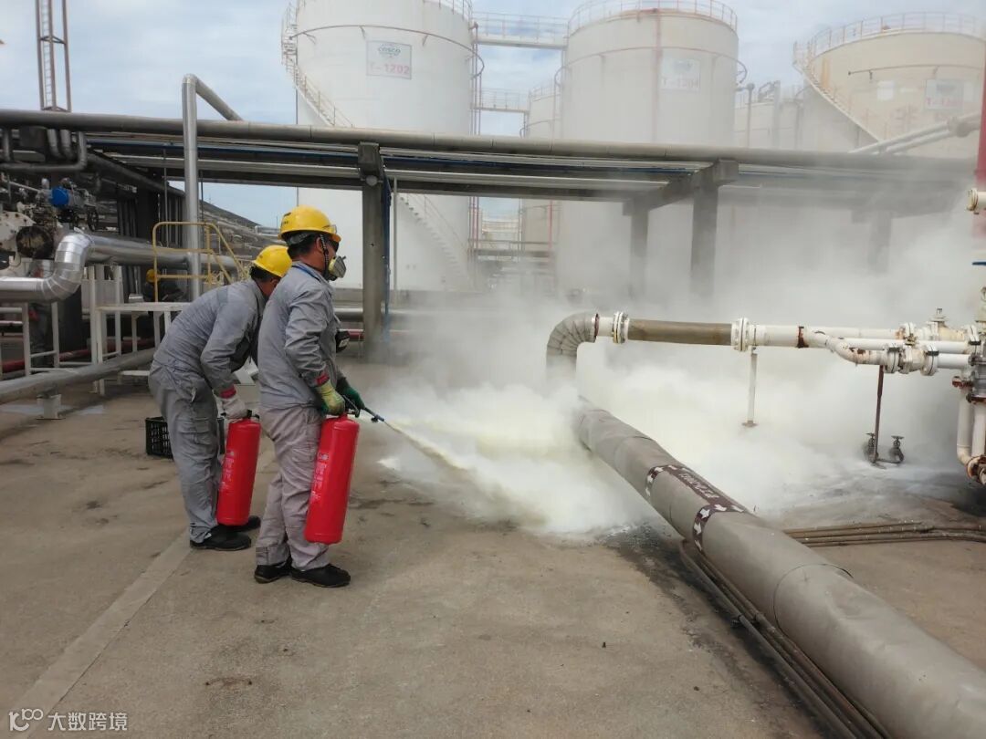 下午两点演练正式启动。本次演练重点检验“查找身边安全隐患”的实际成效,模拟场景设定为浦东海关关员在亿升仓储人员陪同下巡查监管作业场所时,主动发现并报告T3002保税储罐罐边管线法兰发生危化品(1-癸烯,闪点49℃)泄漏,现场已形成蒸汽云。这一关键“身边隐患”被及时捕捉,值班经理立即向演练指挥报告,演练指挥果断下令停止所有作业,启动应急响应。工艺处置组、安全保卫组、防护救护组、后勤保障组等应急单元闻令而动,按预案迅速集结,赶赴现场;人员疏散、工艺隔离、现场警戒、医疗救护等工作同步高效展开。