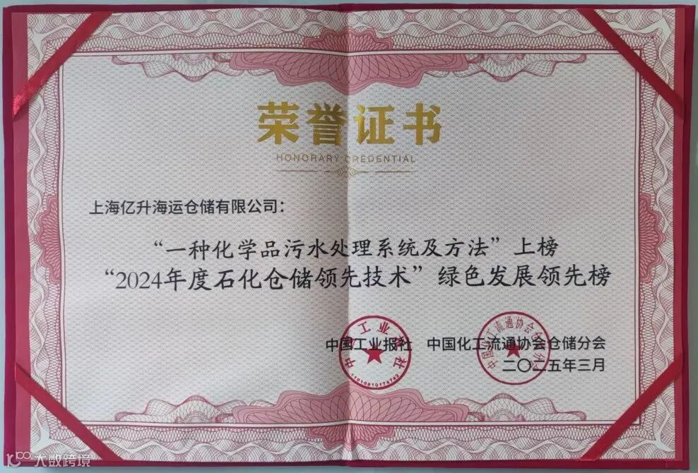近日,由中国工业报社与中国化工流通协会仓储分会联合发布的“2024年度石化仓储领先技术”绿色发展领先榜正式揭晓。亿升仓储自主研发的“一种化学品污水处理系统及方法”成功入选,彰显了公司在绿色技术创新领域的核心竞争力和行业引领地位。