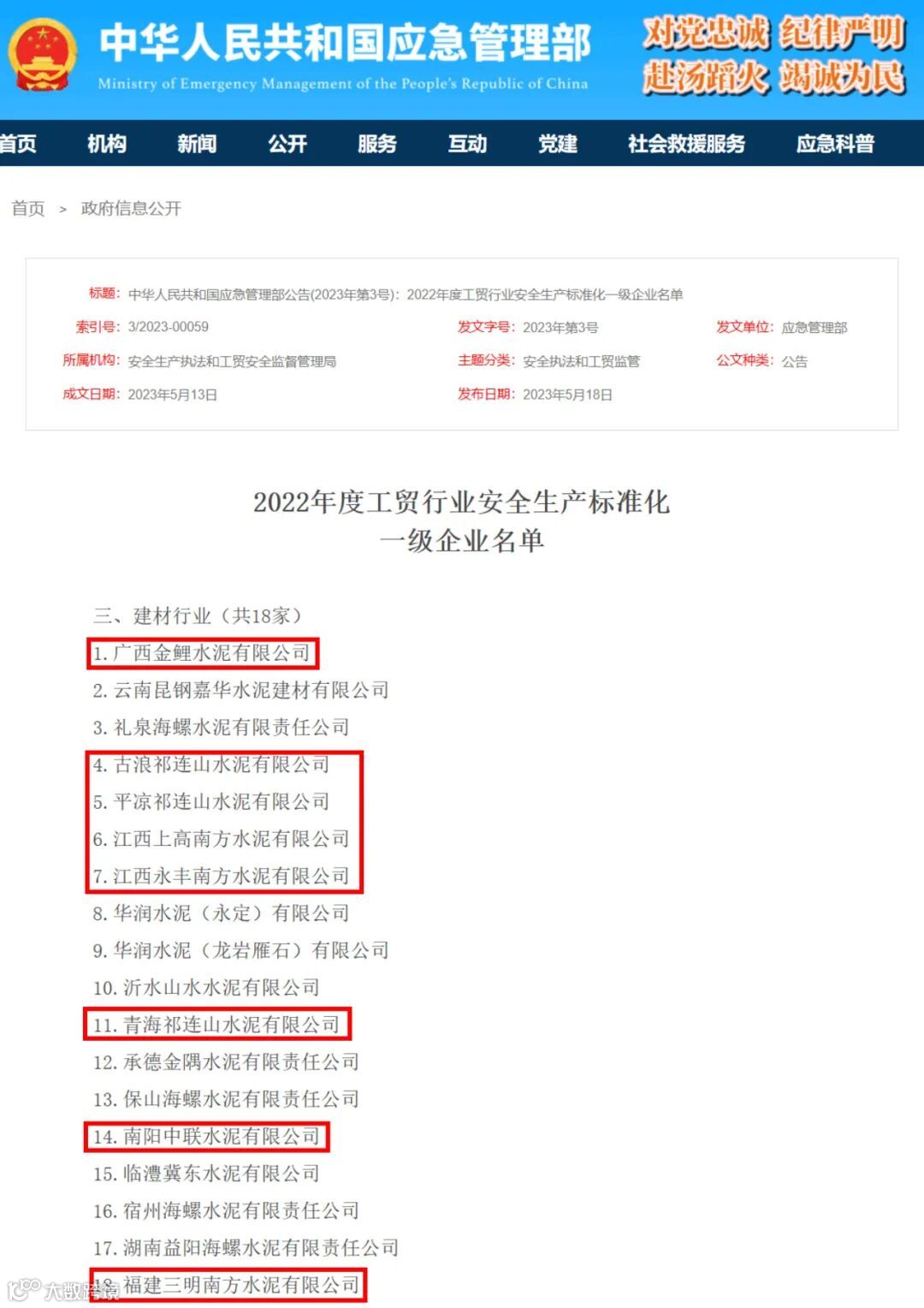 5月18日,应急管理部公布了88家2022年度工贸行业安全生产标准化一级企业名单,其中建材行业共有18家企业。中国建材股份所属被选定具有评审资格的8家全部通过,将在有效期内享受8项激励措施。分别为:广西金鲤水泥有限公司、古浪祁连山水泥有限公司、平凉祁连山水泥有限公司、江西上高南方水泥有限公司、江西永丰南方水泥有限公司、青海祁连山水泥有限公司、南阳中联水泥有限公司、福建三明南方水泥有限公司。