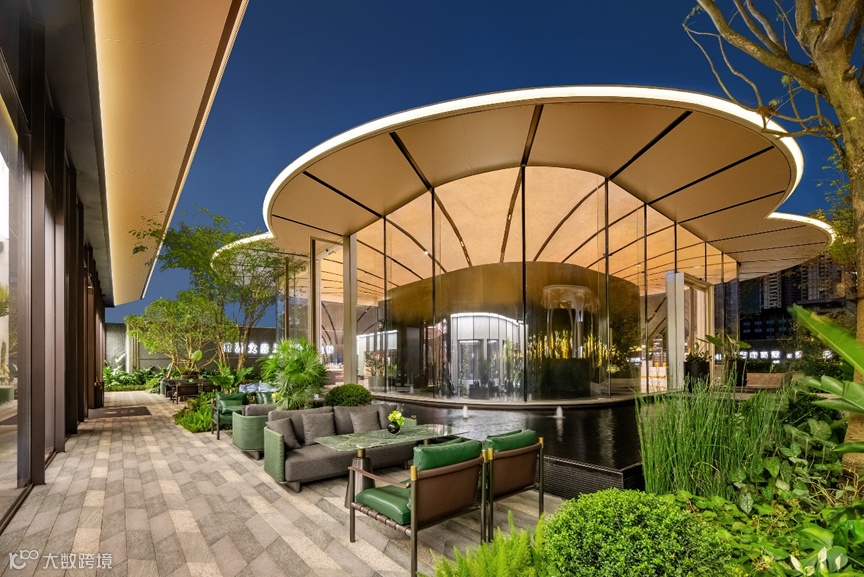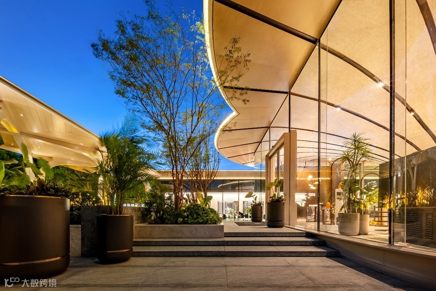 植物的“脉络”曲线从中心出发,从室内延申到室外,将室内外空间串联在一起,并通过统一的材料运用,让室内外空间形成一个整体。