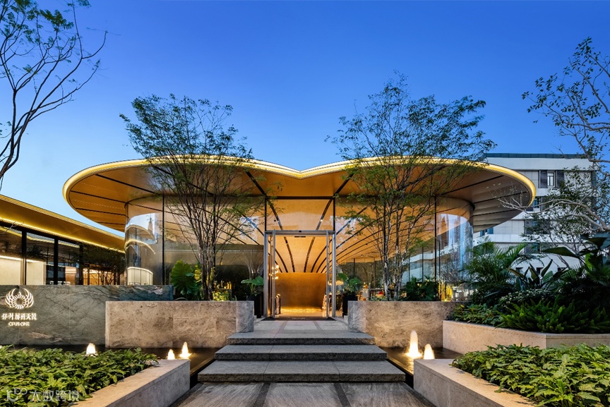 立面色彩与材质灵感来自于“ 老钱风” 奢侈品品牌卡地亚美学色系, 采用暖灰色石材、香槟色铝板、深咖色哑光金属隽永经典美感, 彰显低调奢华的沉稳气质。