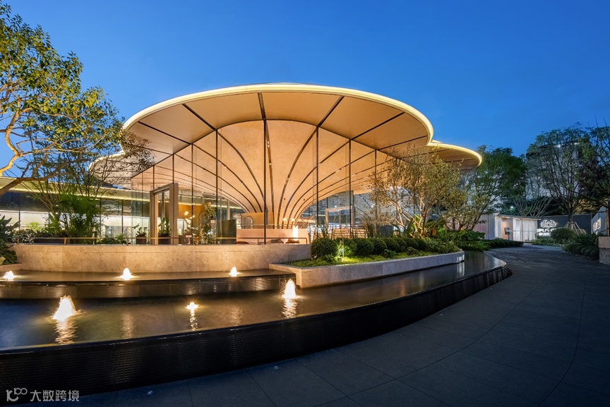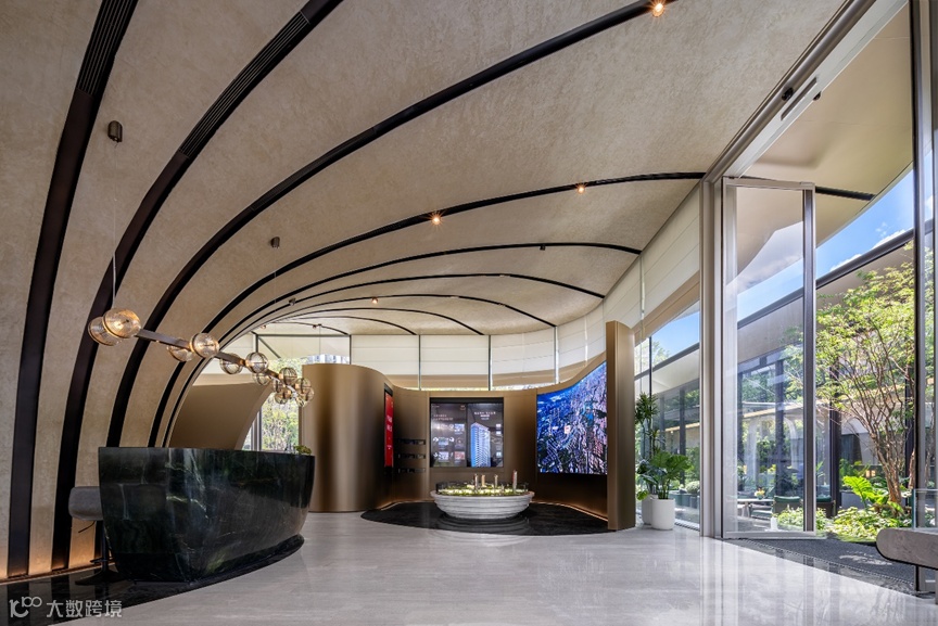 接待中心的内部空间宽敞明亮,层高舒适。全玻璃幕墙立面弱化了室内和室外空间的界限,彼此之间相互交融、沟通。脉络状的结构与吊顶使人文建筑与自然相呼应。