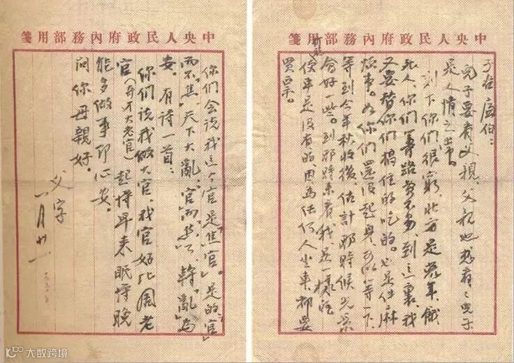 1949年10月,中华人民共和国成立,谢觉哉出任中央人民政府第一任内务部部长。很快消息传回湖南宁乡老家,乡亲们都议论着,山沟沟里出了个大官,真了不起。谢觉哉湖南乡下的两个儿子得知父亲在政府做了“大官”,都想去北京看一看,希望得到一些“照顾”,能够离开乡下,到城里工作。于是在1950年1月,谢觉哉给在家乡的儿子写了这封信。