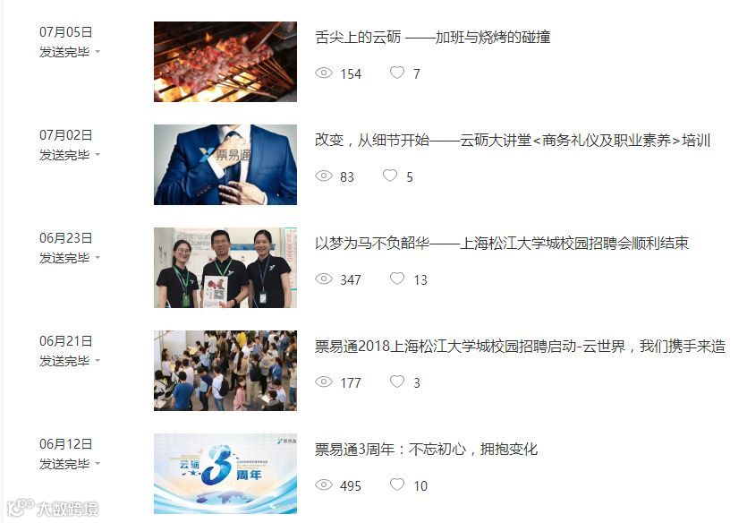 我们的公众号<票易通招聘>是一个让候选人了解我们的平台。公众号内容涵盖全面,包含新闻、公司活动航拍、国际大奖获奖情况、员工活动、培训讲座等。是一个可以让候选人感受到我们企业客户同心,奋斗同行理念的平台,这无疑能使略有犹豫的候选人更愿意走进我们票易通。