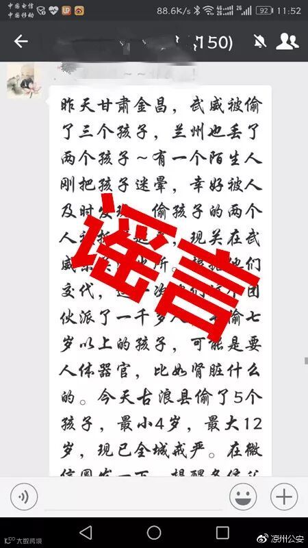 这两天武威、金昌朋友圈及微信圈流传着这样的消息 “昨天甘肃金昌,武威被偷了3个孩子,兰州也丢了两个孩子。有一个陌生人刚把孩子迷晕就被老师及时发现。偷孩子的两个人被抓起来了......现已全城戒严……””