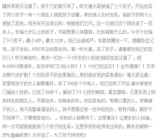 可见这又是一条关于“偷孩子”的造谣事件,之所以用“又”字,是因为仅2015年,就有广西南宁版“专偷7岁以上孩子”、四川绵竹版“卖冰棍车专偷小孩”、陕西西安版“超市有人偷小孩”和江苏扬州版“女子冒充护士偷小孩”等谣言,但最终都被警方证明为谣言。