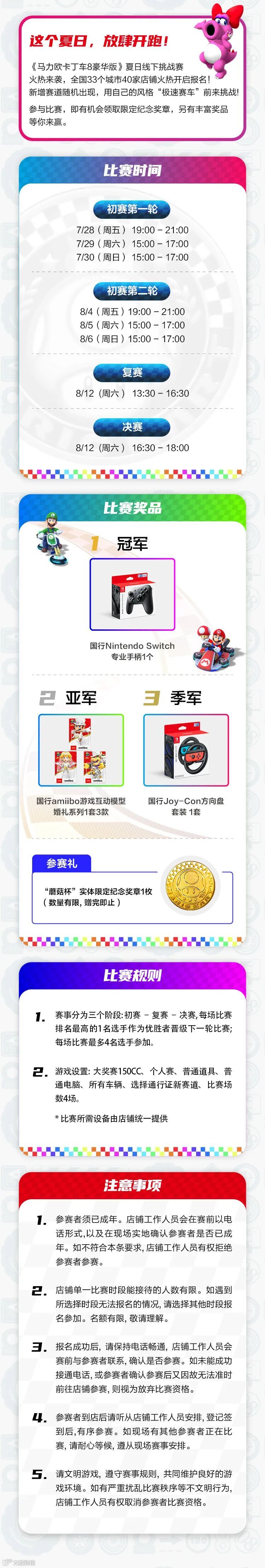 导读:《马力欧卡丁车8 豪华版》夏日线下挑战赛火热开跑!参与比赛,即有机会领取限定纪念奖章,另有丰富奖品等你来赢!