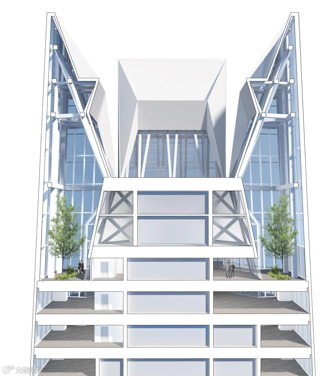 目前来看最吸引人的就是所采用的这个简洁且受力均衡的结构体系,它为建筑内部空间的景观视野及超高大堂效果贡献颇多。