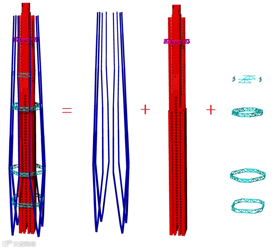 最终的“巨型框架”体系,便是由4道环带桁架将8个巨柱相连而构成,辅以63层的伸臂桁架。