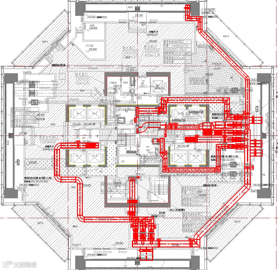 52F避难层消防加压风管位置示意 ©筑博设计