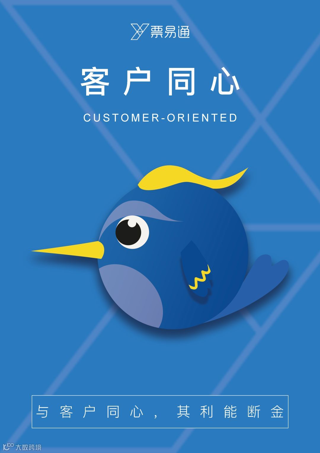 票易通价值观家族里的老大,大家喜欢叫他“同心鸢”。作为客户关系经理的他,喜欢粘着客户,跟客户打交道,处处为他们着想,牢牢锁住客户,让客户信任他,与客户一条心做事。蓝色的羽翼代表沉重冷静,用来形容他再好不过了。