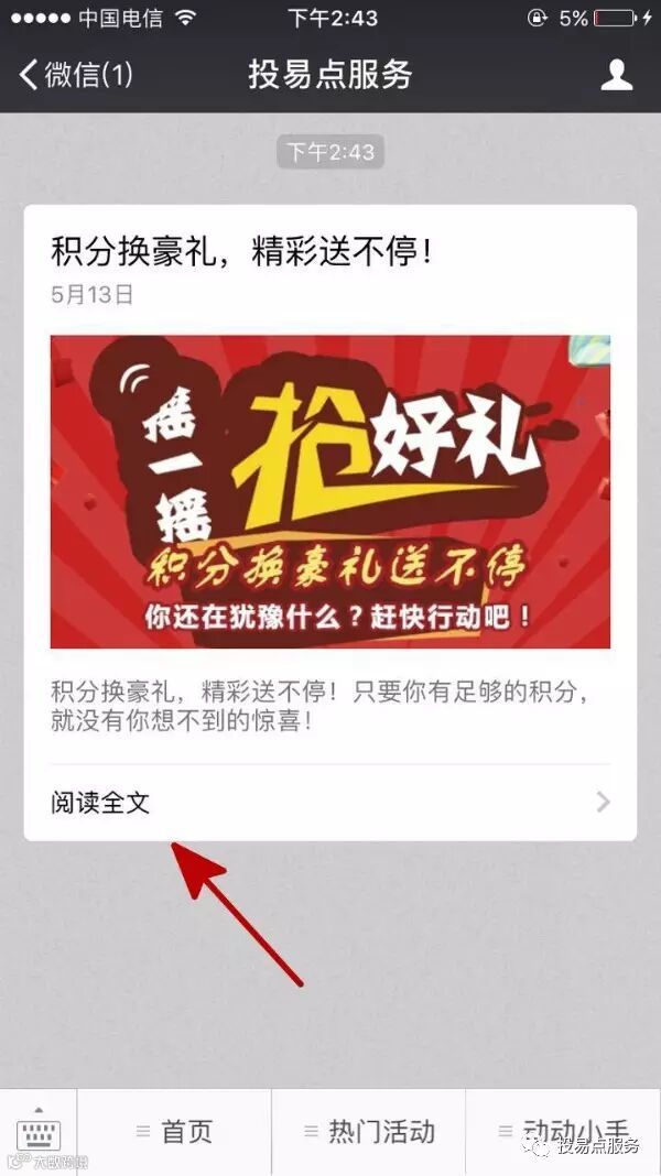 4. 页面出现积分换豪礼,精彩送不停的文章,点击阅读全文,进入摇一摇活动页面.