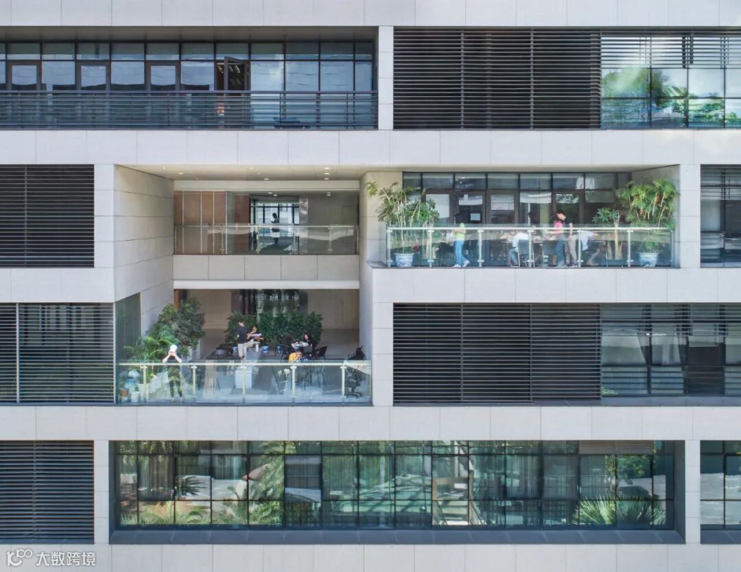 利用建筑外表面营造公共交往空间,层层的退台花园模糊裙房和主楼的分别,外墙上交错设置了阳台。建筑局部设计了贯穿大厦两端的半室外空中花园,让自然风穿透大楼。