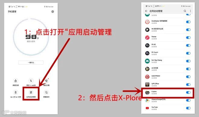 2:回到桌面,找到“手机管家”打开它跟着再打开‘应用启动管理’找到X-Plore点击他