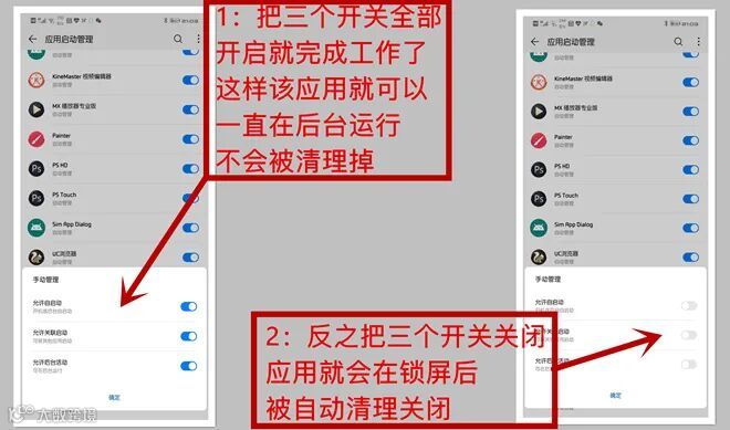 3:然后把下面图1三个开关全部开启就完成工作了这样该应用就可以在后台一直运行不用怕锁屏后给清理掉反之,把图2的3个开关关闭,该应用就会在锁屏后被自动清理本帖隐藏的内容。