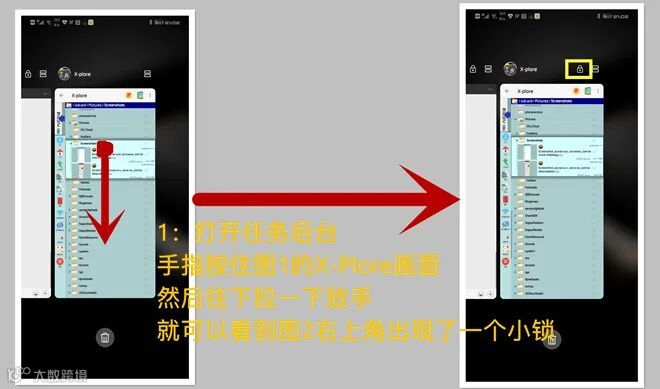 1:首先打开X-Plore然后打开任务后台手指按住图1的X-Plore画面然后往下拉一下放手就可以看出现