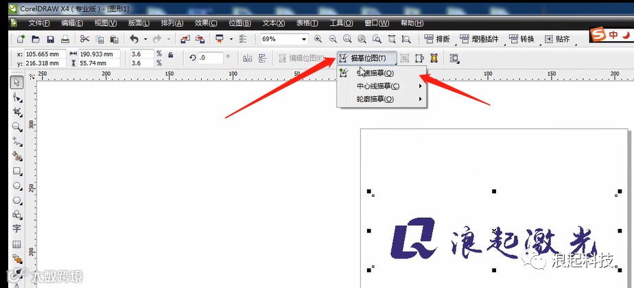 格式保存JPG即可,然后我们打开CorelDRAW X4软件,导入浪起激光JPG位图,然后点击位图临摹-快速临摹。(参考图一)