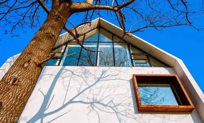 远山近林是场地内最直观的感受,为了不改变原有的场所感,树木被尽可能地保留。建筑被植被包裹,人又被建筑包裹,保留了原始的“犹抱琵琶半遮面”的隐秘感的同时,行走在地面层时的体验也变得层次丰富了起来。同时不同季节林木形态不同,环境的通透性也会变得不同,在夏季茂密的叶片与冬季裸露的枝干掩映下,建筑的可视度也随季节有所差异。