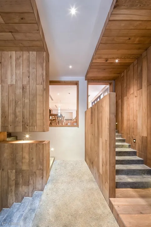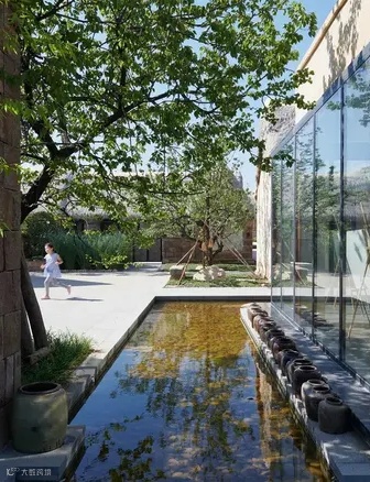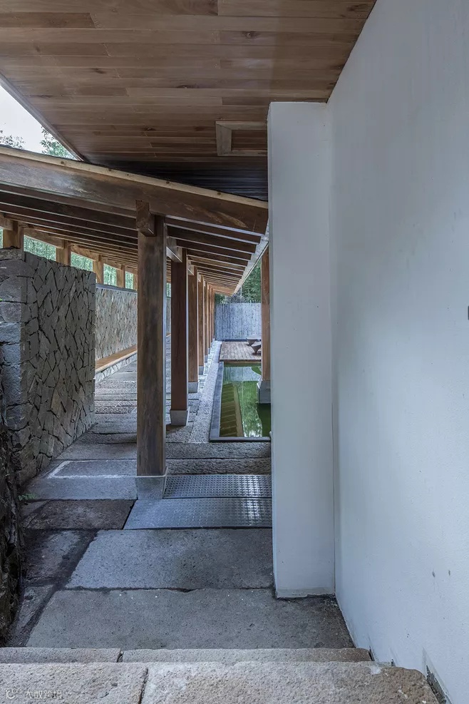 建筑用地是由三个宅基地组成,长条状地块,在东西方向上有将近3米的高差,两个宅基地位于西侧,一个宅基地位于东侧下端,刚好建筑就形成了两个主体量,一高一低,一大一小,中间用一部半通透的楼梯廊道链接两边。而场地又南高北低,利用原有场地的关系顺势挖了一部分地下空间,作为后勤储藏和设备用房,东侧的这部分高差则设计成一个开放的灰空间,为客人提供半室外的灵活空间使用。场地中的水系景观也顺着室外场地台阶逐级流下,形成多个小瀑布水口,构成流水声一直伴随着行走路径的体验。