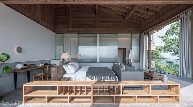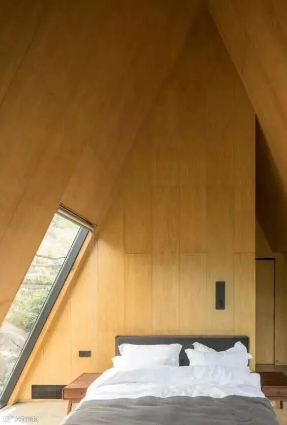 木屋酒店由十栋40平米左右的独栋木屋组成,坐落于陡峭的岩山上。木屋酒店主体采用木结构,以挑高的钢结构平台作为基座,提高施工效率的同时尽量不破坏原有的岩石地貌,使建筑及流线与原生态岩石群形成互动。外墙的淬火木以现场制作的方式完成,减少运输成本,并采用简易的工法达到设计效果。为了降低木屋酒店在环境中的存在感,设计排除了复杂或夸张的建筑形式,选取了三种简单的基本几何形态;每栋建筑作为独立客房,在保证室内舒适度的基础上将体量最小化,不过度消耗景观场地的空间。