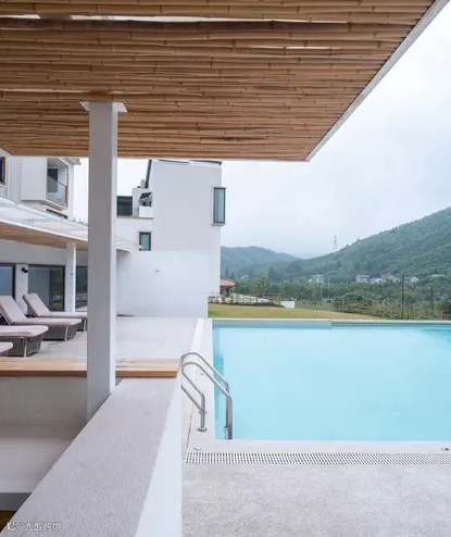 鱼乐山房位于杭州临安太湖源,原本是一对农民夫妇在自有土地上经营的老牌农家乐。由入口进入廊架,阶梯抬升的方向及上部屋顶的倾斜,进一步强化了地形的抬升与山景的高低。项目被青山环绕,山景透过窗渗进建筑内。酒店中也有大量水景,让人在现代优越的室内环境里同样能享受到山水情怀。