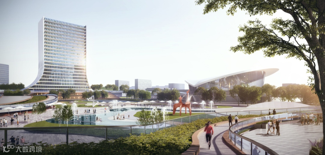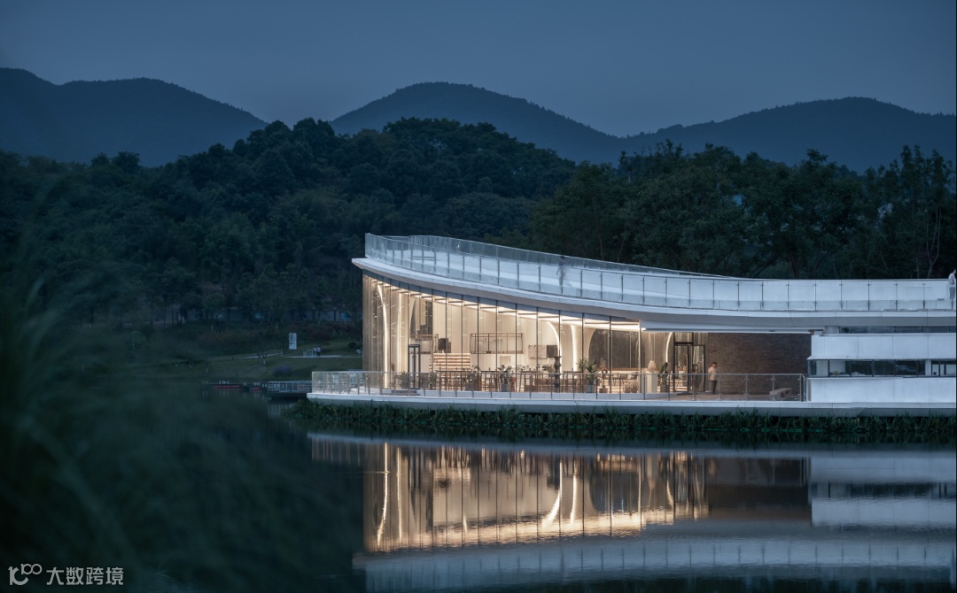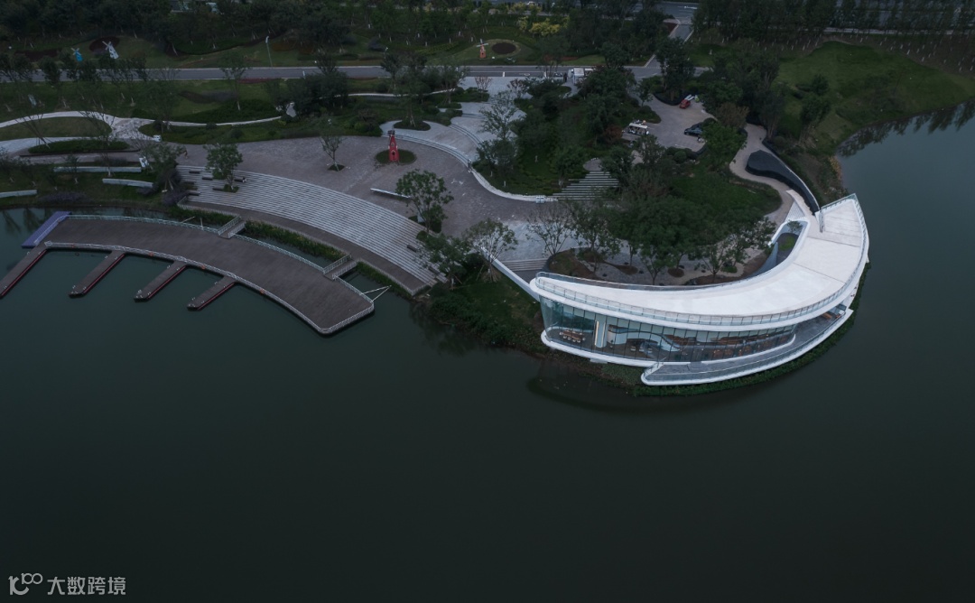 建筑寻求新的设计出发点和功能空间组合方式,从“新月”形象中抽取设计元素,最终抽象拓扑出建筑体量形态。方案将观景平台、咖啡馆等娱乐空间与办公空间集中设置,并以开敞空间进行区分,以一种多元化、现代化的方式展示了未来公园配套的发展蓝图。以干净利落的弧线勾勒出湖岸线的形态,与湖岸线契合,是对自然的尊重和呼应,又强调了建筑融于景,融于生活的姿态。