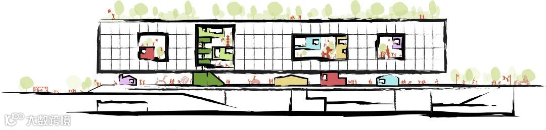 利用基地南北10米高差,进行全地形开挖,设置半地下的大体量共享功能底盘,校园主入口从临街的负二层标高进入。