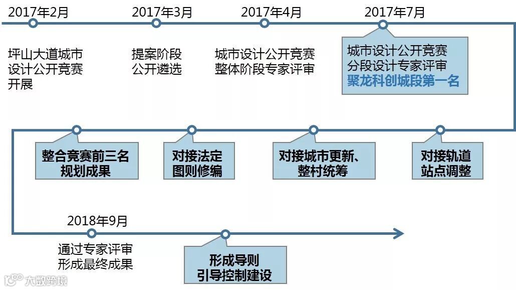 2017年月市区两级政府主管部门组织开展“坪山大道城市设计公开竞赛”,经过提案阶段、整体阶段、分段设计等多轮投标,最终由筑博设计中标并承担聚龙科创城段成果整合深化工作。规划成果于2018年12月通过区政府审查后,由官方媒体发布,受到社会各界的广泛关注。展示了坪山区良好的城市形象,获得公众一致好评。