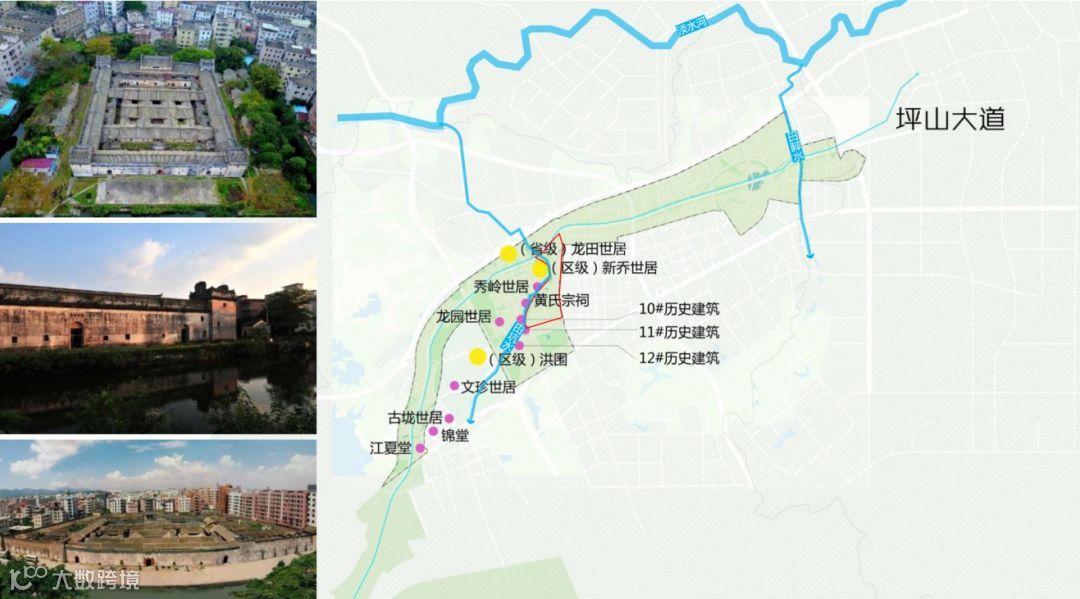 ▲片区中部有1处历史村落,名为秀新村,环绕着田坑水,至今仍然保留着历史村落的肌理和风貌,散发着浓郁的客家民居气息。片区及周边共有围屋9处、宗祠建筑2处,客家文化底蕴深厚