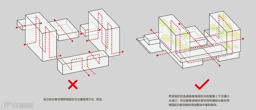 贯穿园区的连廊设计除去丰富景观游览线路的设计思考外,能够使园区内的重复上下交通大大减少,并且能够容纳共享空间和辅助功能空间,使园区内部流线更加丰富和高效。