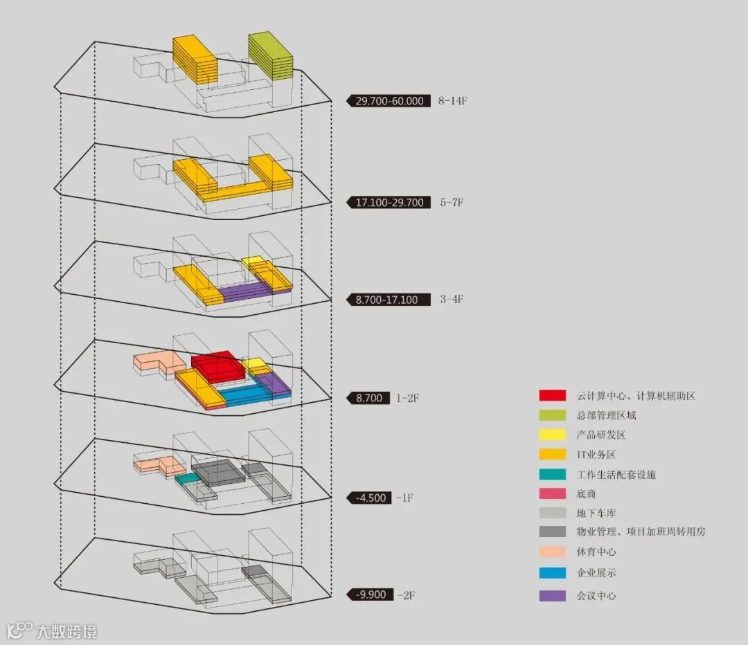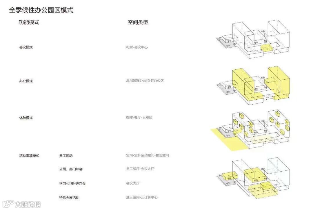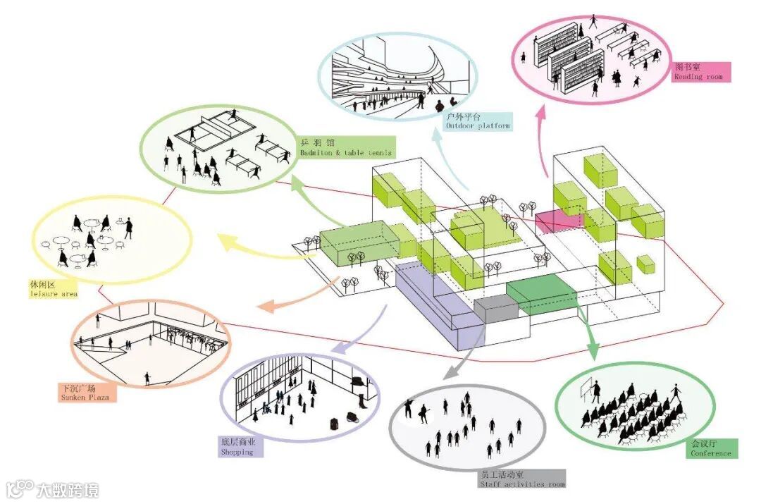 办公空间可分可合,为创造宽敞,丰富的室内空间提供了条件。园区的公共服务功能位于建筑北侧,西北侧为商业休闲区,东北侧为体育运动区,员工活动区位于西侧及南北侧,西南侧为会议区。