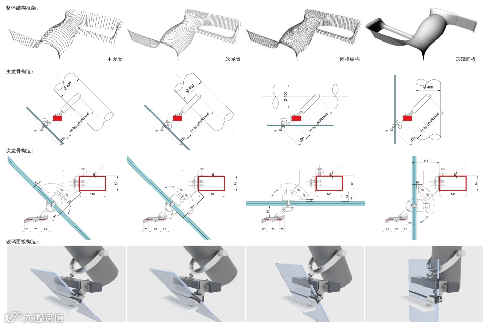 另外,尽管裙楼有大量的曲面,几乎找不出几块相同的玻璃,我们仍设计了一个标准的节点系统来适应任何形状及任意角度的玻璃安装。通过尽可能平面化的主次龙骨结构体系,和吸纳了「单元式幕墙」构造特点的,类似「齿轮」机制的抓节点设计,大大提高了建造效率。