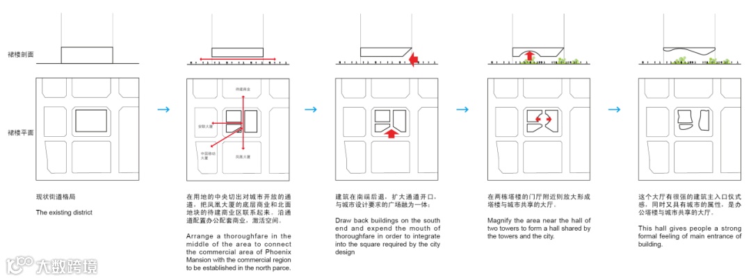 我们选择了以退为进的策略来破解项目中的矛盾。一方面,我们决定不去讨论到底设计出怎样标新立异的塔楼能在周围楼宇的夹缝中与他们争奇斗艳,而是设计两座方整简约的塔楼,以理性谦逊的姿态融入到整个中心区的城市肌理中,这实际上也符合银行建筑庄重低调的气质。