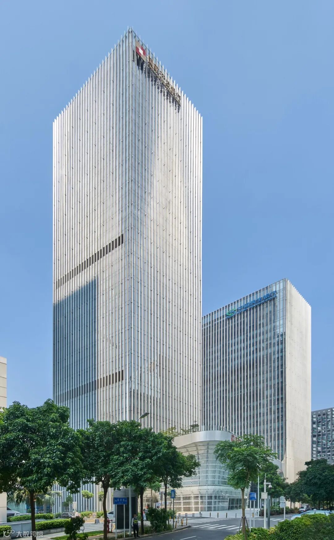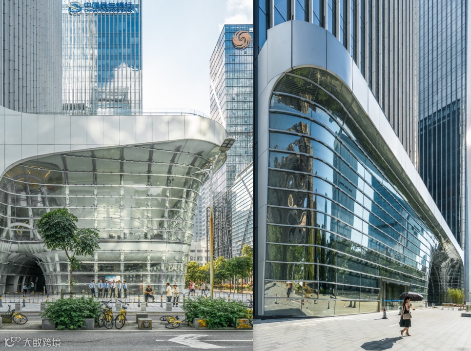 裙楼的流线造型从「共享大厅」延伸到西南和东北两个角落,布置公共性更强的银行营业厅、配套商业等公共功能,进一步激活空间的公共性;而西北、东南角则让塔楼直接落地。「软」的裙楼公共界面和「硬」的塔楼形象面碰撞融合,让整个建筑更加生动。
