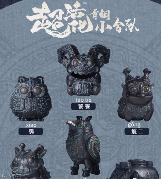 陕西历史博物馆的“青铜小分队”系列盲盒也成了热门,设计者以商周时期的青铜器皿和纹样为基础,参考鸮(xiāo)、饕餮、觥[gōng]大、觥二、牺尊、凤鸟等形象创作出趣味性满满的Q版手办,这款盲盒的抽奖微博收到了4万多的转评赞。